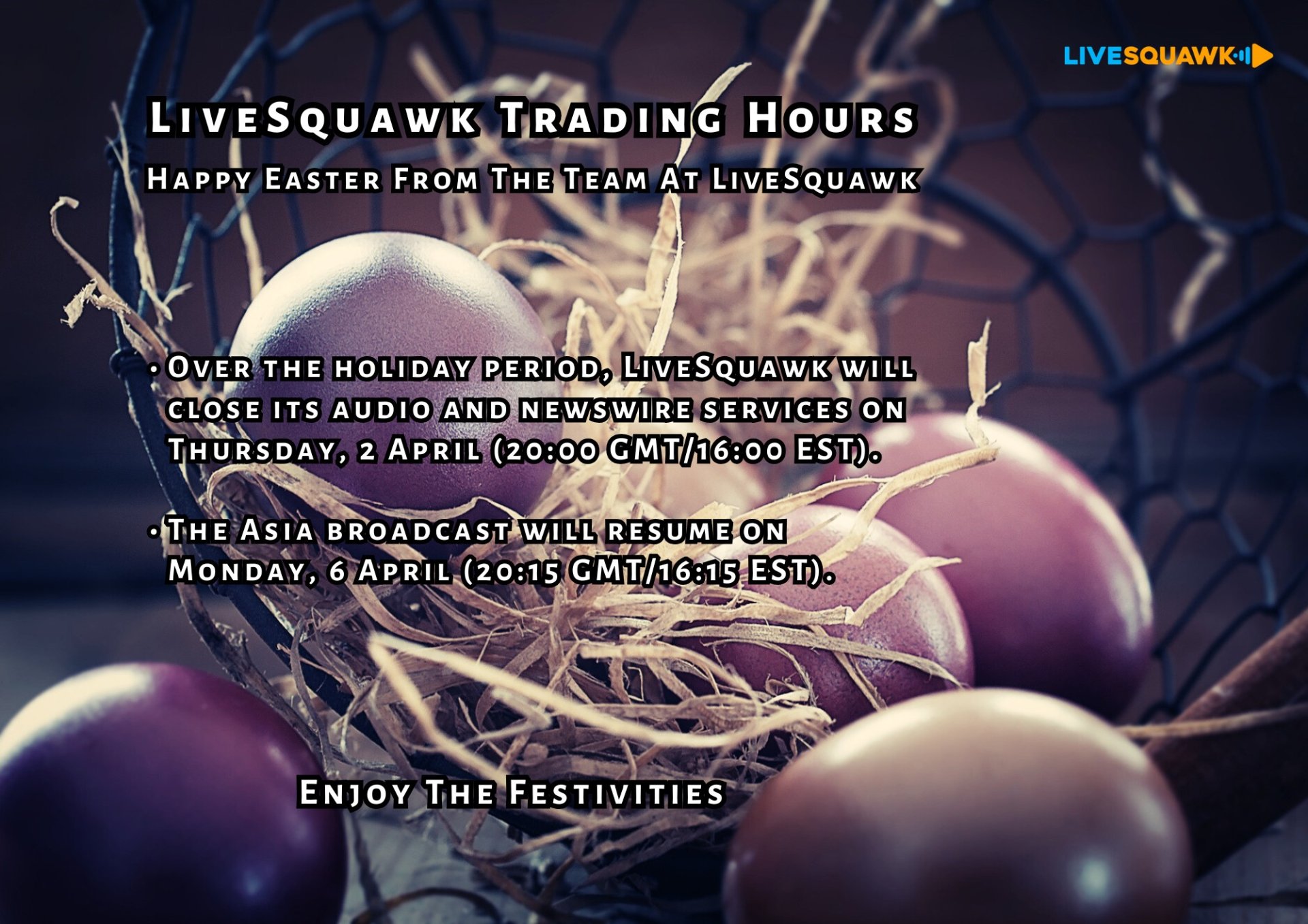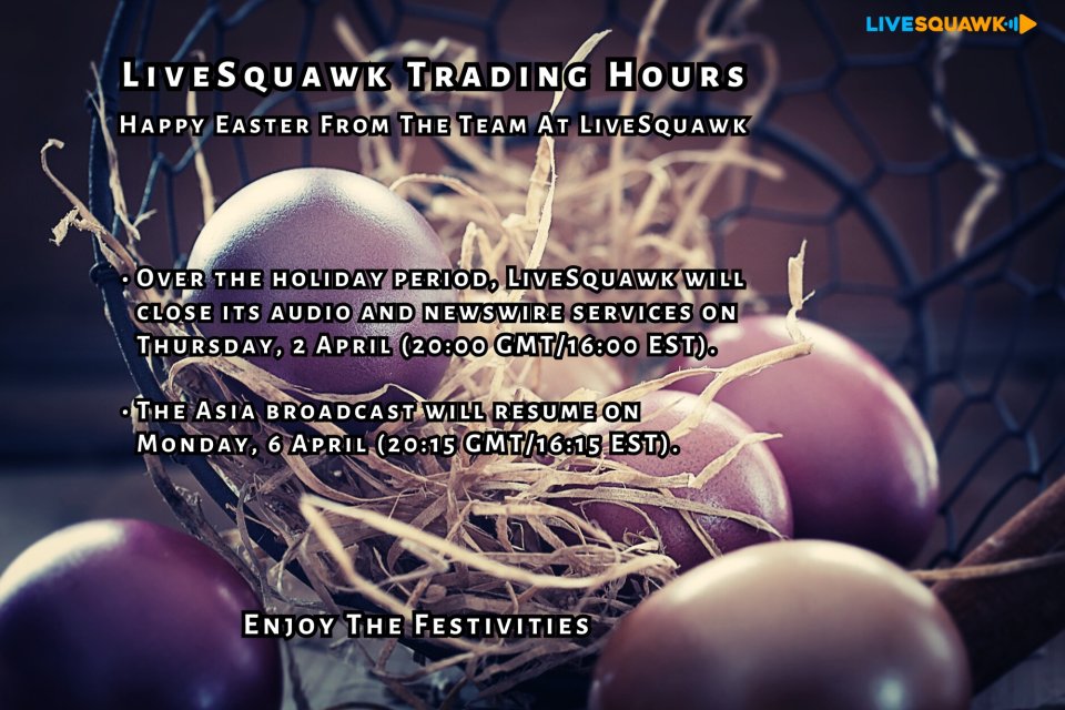 Over the holiday period, LiveSquawk will close its audio and newswire services on Thursday, 2 April (20:00 GMT/16:00 EST).