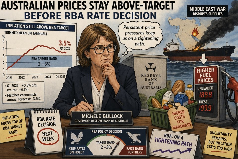 Australia’s inflation remained above the top of the Reserve Bank’s 2-3% target band as higher fuel costs from Middle East supply disruptions compounded already-elevated price pressures to keep policymakers on a tightening path.