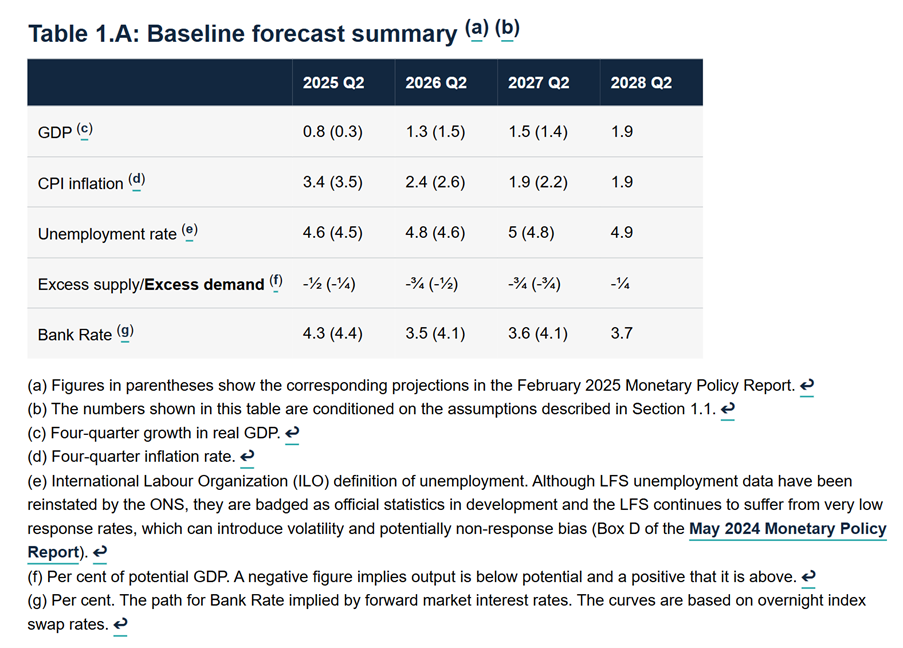 As part of its Monetary Policy Report, the BoE also issued revised economic projections, lowering both growth and inflation expectations compared with its February assessment.