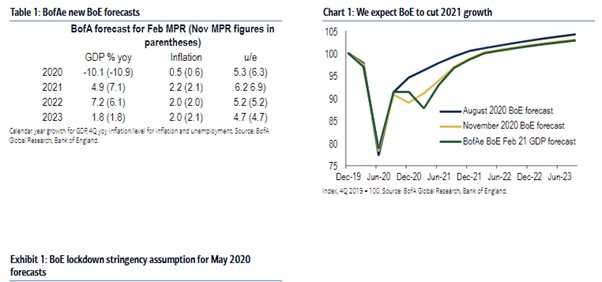 Bank analysts expect the BoE to cut its 2021 growth forecast and boost expectations for 2022 as a result of the new lockdown and the so far successful vaccine rollout.