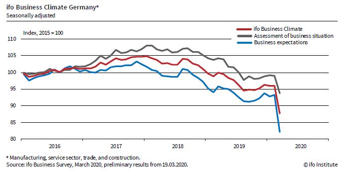 Frankfurt, 19 March 2020 (LS NEWS) – German business confidence has collapsed to its lowest level since August 2009 as companies and countries around the world continue to shut down.
