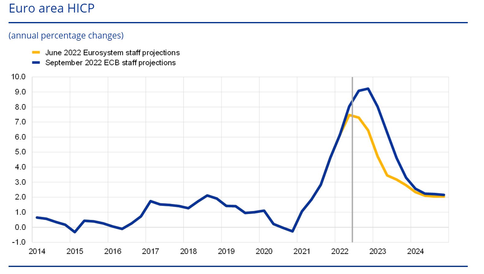 Inflation in the euro area rose to a record 9.1% last month, according to preliminary information from the EU, and the ECB raised its inflation outlook as part of its quarterly forecast report. It said inflation this year is expected to average a whopping 8.1% versus the June estimate of 6.8%. Next year’s projection was raised two full percentage points to 5.5%, with the following year coming more in line with the bank’s target at 2.3% compared to the last forecast of 2.1%.