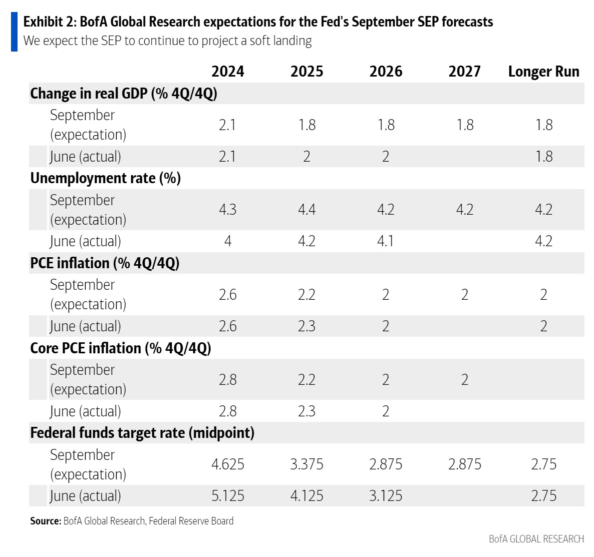 “We expect the 2024 median to show 75bps of cuts. Accelerating cuts in November or December after starting with 25bps in September would imply that the Fed made a policy error,” said BofA.