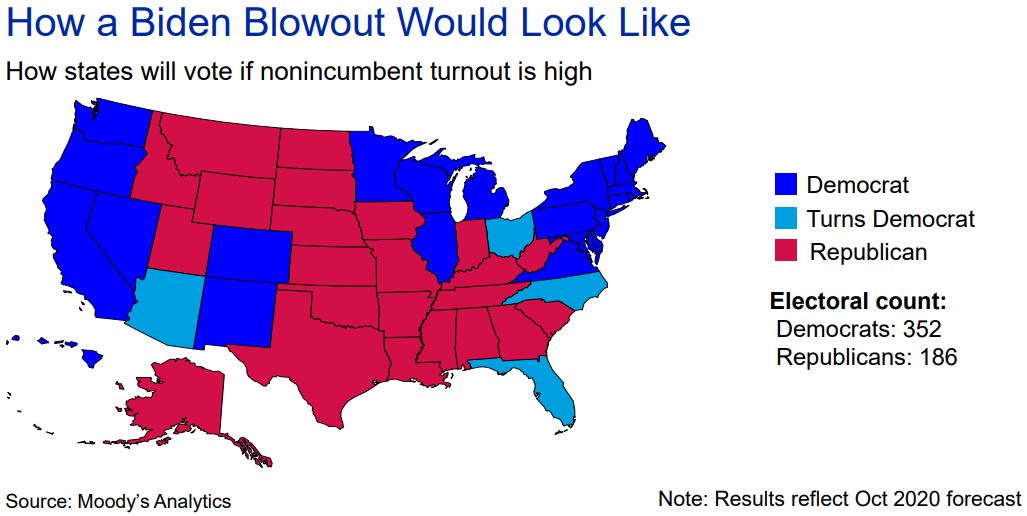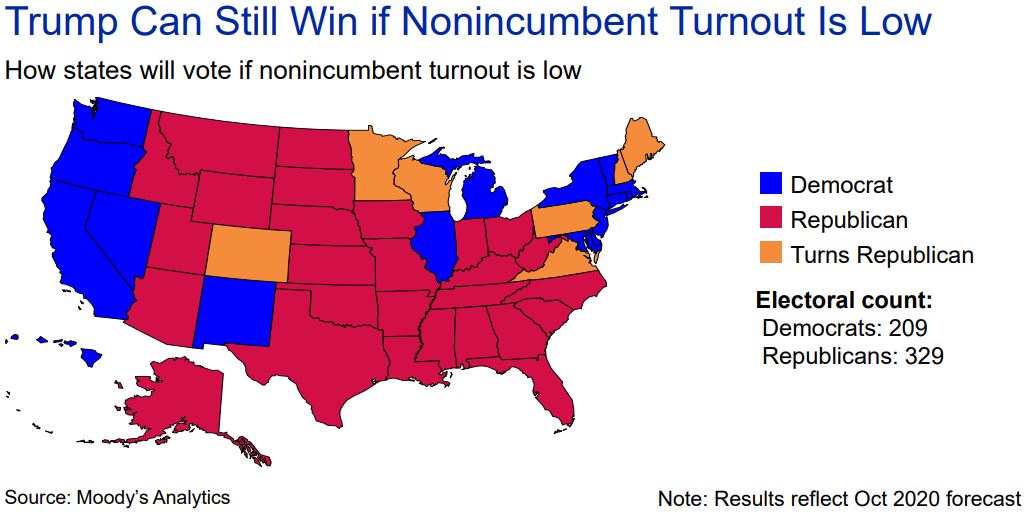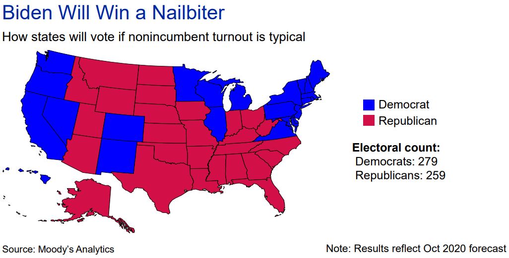 Trump’s opponent, former vice-president and Democratic challenger Joe Biden, offers a traditional approach and currently lies comfortably ahead in the national polls. Assuming the nonincumbent vote (Democrats and independents as a share of overall state voters) is typical, Moody’s analytics project Biden will defeat Trump with 279 electoral votes to the president’s 259 votes.