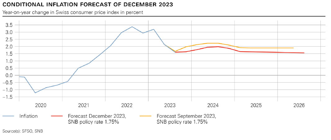 Further declines in consumer price growth are supporting a more dovish tack. Headline annual inflation in the alpine country fell to 1.4% last month, and the SNB cut its forecasts for the coming two years Thursday, dropping the annual average expected in 2024 to 1.9% from the September estimate of 2.2%, and the 2025 prediction to 1.6% from 1.9%. As Jordan noted, this puts the predictions for the duration of the bank’s projections within its target range of 0-2% for consumer price growth.