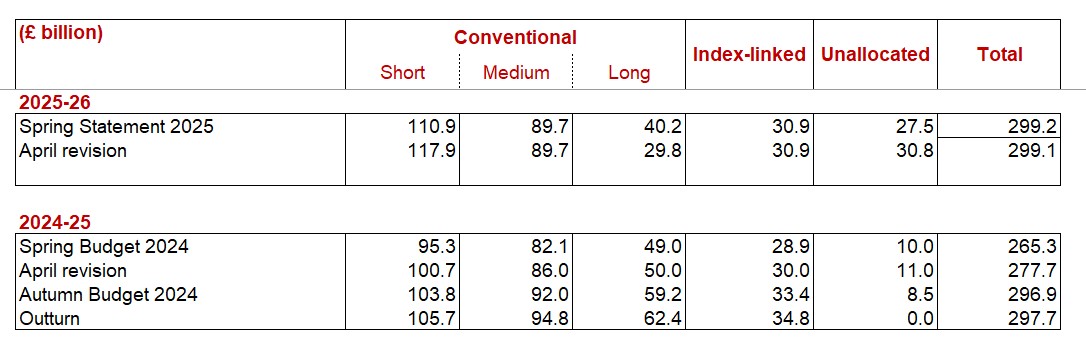 Each year, HM Treasury sets a financing remit for the Debt Management Office (DMO) covering planned gilt sales and the split between index-linked and conventional gilts, including their maturity distribution. The remit is usually revised in November or December alongside updated public-finance projections.