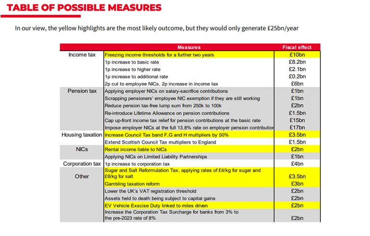 Deutsche Bank’s Sanjay Raja said the bulk of the Chancellor’s consolidation is likely to come from extending the freeze on personal tax thresholds. “We also expect the Chancellor to push through a medley of tax rises (GBP ~30bn) targeting wealth (dividends, capital gains tax, etc.), expanding the National Insurance Contributions base, and a slew of sector-specific taxes. Higher taxation on housing (council/mansion tax) will also likely feature in the Budget,” he said.