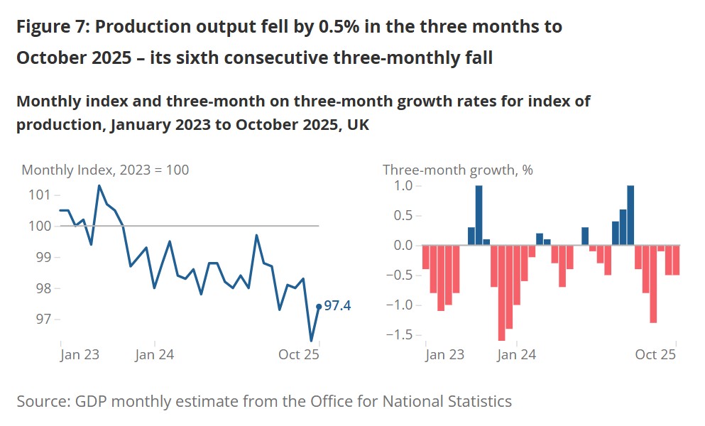 Breaking down the report, ONS director of economic statistics Liz McKeown pointed to a further decline in production alongside stalled services output as the main drivers of the three-month-on-three-month contraction.