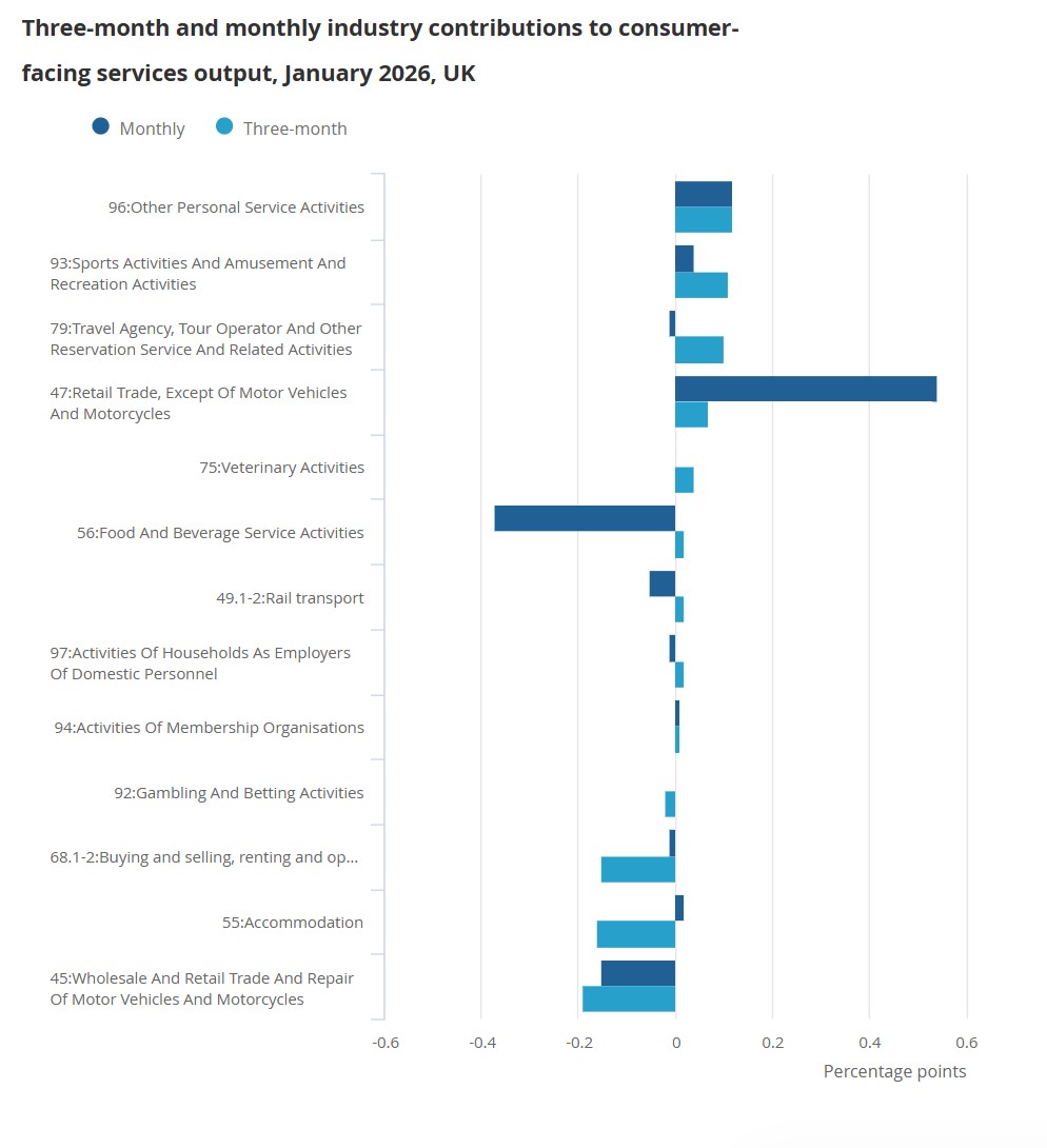 In the three months to January, GDP rose 0.2%, a tenth below forecasts but higher than the 0.1% recorded in December and an improvement on the flat reading in the three months to November. On the month, output was unchanged, missing expectations for a 0.2% rise and slowing from the 0.1% gain previously.