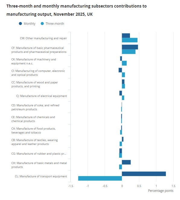 Construction also dragged, with output down 1.1% after a 0.3% fall previously. The ONS said this extended a pattern of slowing three-monthly growth since May and marked the weakest reading since March 2023.
