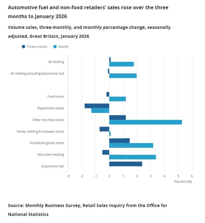 The Office for National Statistics (ONS) said headline retail sales surprised to the upside, rising 1.8% m/m in January, the largest increase since May 2024. The figure was sharply higher than the 0.2% forecast and December’s 0.4% gain. On an annual basis, sales jumped 4.5%, well ahead of the 2.8% forecast and a marked pick-up from December’s downwardly revised 1.9% rise.