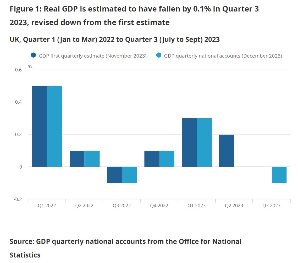 Amended economic output figures for Q3 and previous quarters of 2023 were also released Friday morning. Statisticians said the GDP growth was estimated to have contracted by 0.1%, downwardly revised from the initial flat print. Q2 was also adjusted lower, to show no growth over the period versus a previous 0.2% increase.
