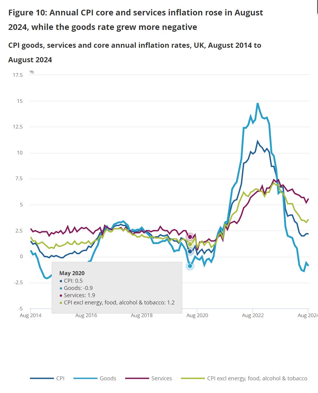 Within the core read, annual CPI services grew 5.6% from 5.2% last whilst the goods component fell 0.9% versus a 0.6% drop in July.