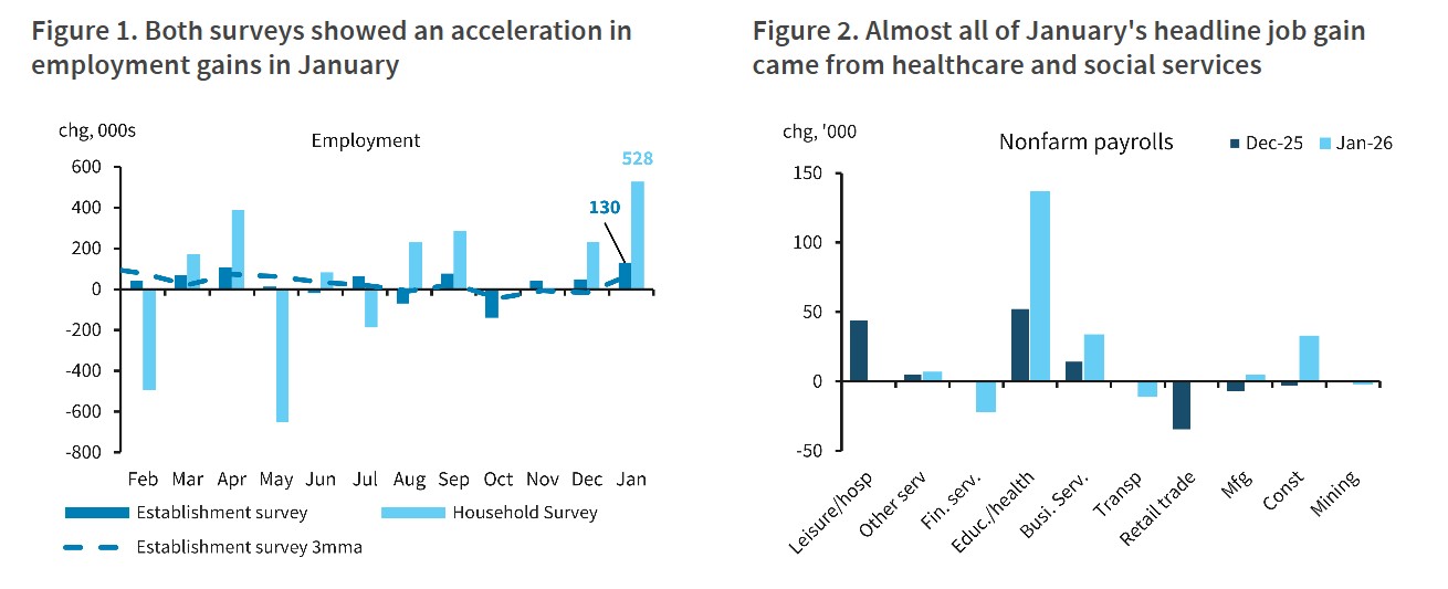 On Wednesday, the BLS said January nonfarm payrolls rose 130,000, comfortably above the 68,000 consensus. Gains were concentrated in health care, social assistance and construction, offsetting job losses in federal government and financial activities. The unemployment rate edged down a tenth to 4.3%, though it remains above the 4.0% level seen a year earlier.