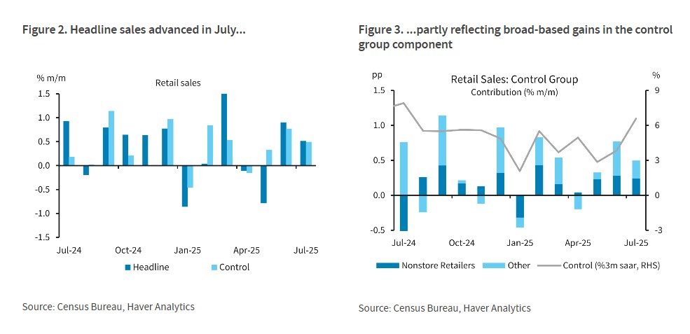 The control group — which excludes food services, autos, and building materials, and feeds directly into GDP estimates — increased 0.5%, slightly ahead of forecasts but down from June’s 0.8%. The annualised three-month average rate rose to 4.4% from 3.9%, the highest since April.